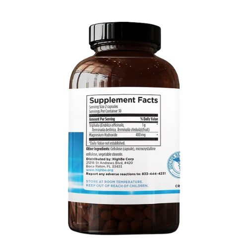 HighBe Triphala is an Ayurvedic herbal formulation that supports healthy digestion and absorption. This special formula with added magnesium hydroxide helps maintain bowel movement regularity while nourishing the intestines. Triphala supports aids with natural and gentle colon cleansing without causing the irritation of laxatives.
